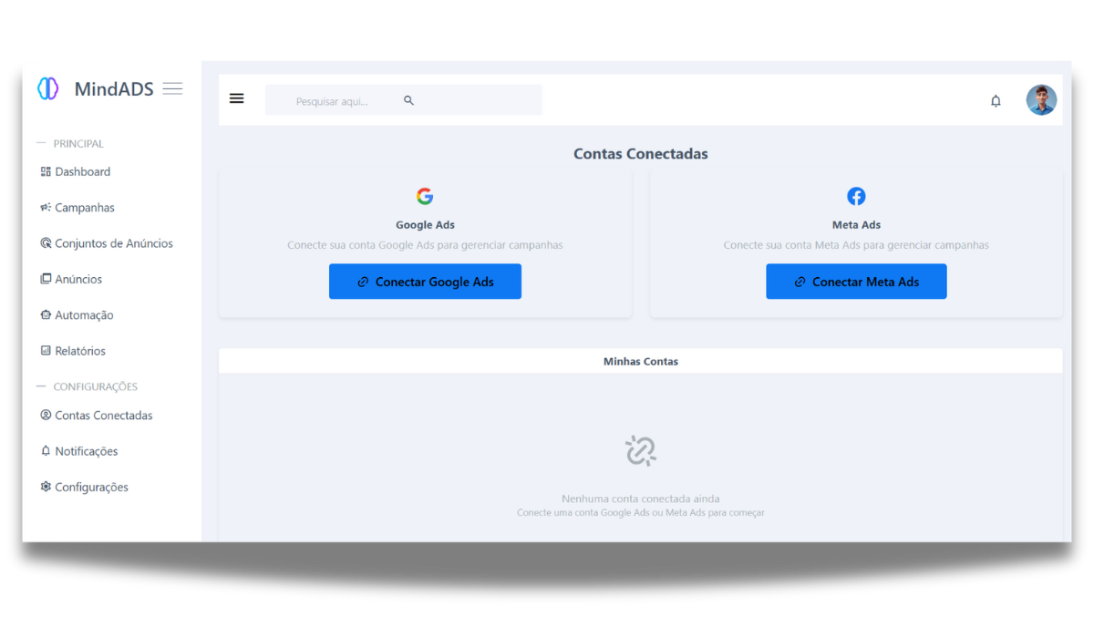 A MindAds conecta suas contas, analisa dados e executa otimizações automáticas com base em resultados reais. Tudo sem que você precise mexer em nada.